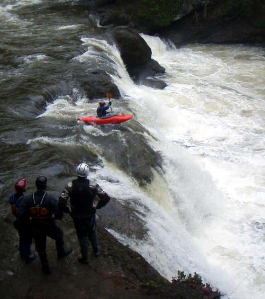 Next guy down was Oliver, who took the more difficult left line, and immediately proceeded to flip off of a mid-stream pillow, flush through the rapid upside down, miss a roll in the pool, and swim into the downstream ledges. Leif, Jeff, and *FHN* took off downstream and were quickly out of sight. Chipper was left in the eddy above Ken and Barbie, and with no boat support downstream I motioned for him to portage. He did, and we ended up deciding to hike out to the road at that point since our group was split up and we didn't want to potentially add to whatever rescue was going on downstream with Oliver.